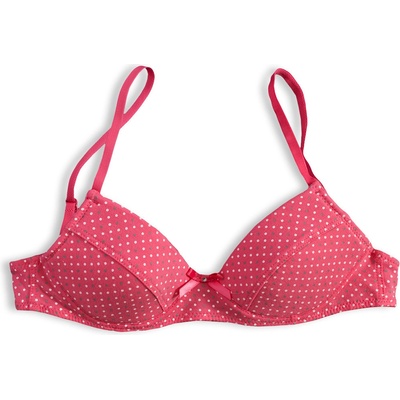 Dívčí podprsenka s mírně vyztuženými košíčky, bez kostice. Ramínka s nastavitelnou délkou. Vzadu zapínání na háček, 3 polohy. Potisk drobných puntíčků.