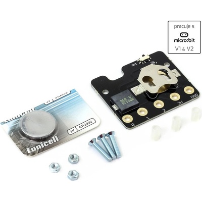 Rozšiřující modul pro napájení BBC micro:bit z vložené 3V baterie s piezo bzučákem a vypínačem.