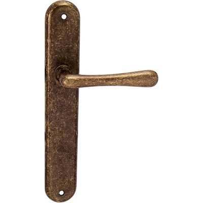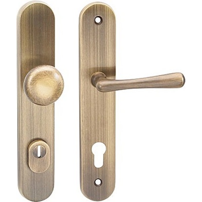 Mosazné kování MP - ELEGANT klika Štítové kování pro klasický i rustikální styl v různých provedení. Mechanizmus OBSAHUJE VRATNOU PRUŽINU. Kování s oválným štítem je vyrobena z...