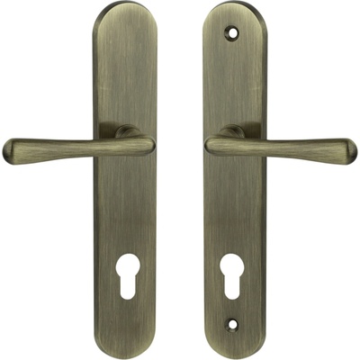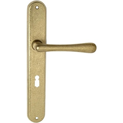 Mosazné kování MP - ELEGANT klika Štítové kování pro klasický i rustikální styl v různých provedení. Mechanizmus OBSAHUJE VRATNOU PRUŽINU. Kování s oválným štítem je vyrobena z...