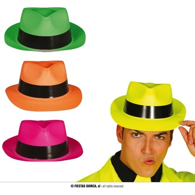Plastový klobouk Gangster - 4 druhy Plastový klobouk - mix druhů. Výška klobouku je 12 cm. Barva - oranžová, růžová , žlutá a zelená
