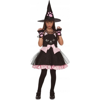Dětský fialovo-černý kostým pro malou čarodějnici. Tento převlek je vhodný na Halloween nebo pálení čarodějnic či karneval. Součástí kostýmu jsou šaty s nášivkou kočky a klobouk.