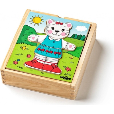 Oblíbená dřevěná "oblékací" skládačka pro malé děti. Děti zde mají možnost si dle vlastní fantazie oblékat a měnit postavičku kočičky. Mají k dispozici obličeje znázorňující...