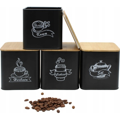 Sada 4 nádob na káva čaj cukr sůl BRUNBESTE BB-4263 (nápisy PL) - BARVA: Černá - MATERIÁL: Nerezová ocel / bambus - VELIKOST: 11.5 x 11.5 x 12 cm Sada 4 nádob na skladování...