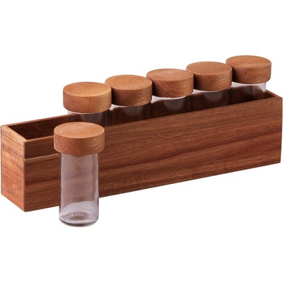 Dodejte chuť stolování. Šest skleněných kořenek s dřevěným uzávěrem a odnímatelným perforovaným víčkem uchová vůni koření, bylinek a různých dochucovadel a udrží je v suchu....