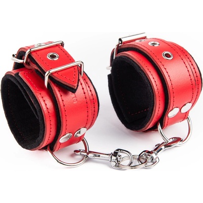 Kožená červená pouta na ruce red/black podšitá černou plstí. Šířka pout je 5 cm a obvod 14 - 25 cm. Pouta jsou spojená dvěma karabinami, které se dají rozpojit. Po stranách pout je ozdobné kování.