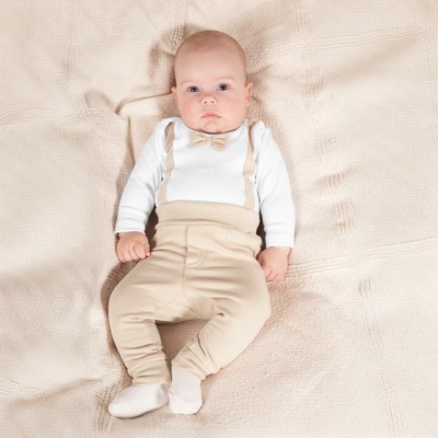 Krémové body s dlouhým rukávem pro kluka. Výrobek má béžové podvazky a motýlka. Materiál je certifikován podle Oeko-Tex Standard 100 Trustworthy Textiles. Výrobek se zapíná na...