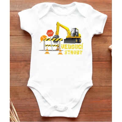 Vtipné a originální dětské body s potiskem - Bagr - Vedoucí stavby. Originální a vtipný dárek pro novorozence nebo pro všechny dětičky do 3 let.