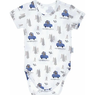 Body s krátkým rukávem pro kluka, perfektní do teplých dnů, ze 100% bavlny, s motivem lesa a pejskem v autíčku. Materiál je certifikován podle Oeko-Tex Standard 100 Trustworthy...