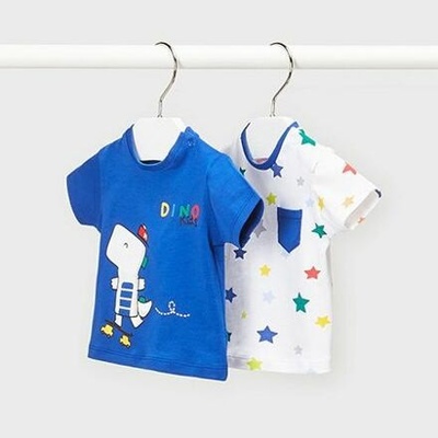 Trička z kolekce Newborn módní značky Mayoral. Tmavě modré triko s veselým orázkem a bílé triko s pestrobarevnými hvězdičkami. v balení dvě trička na rameni baby patenty pro...