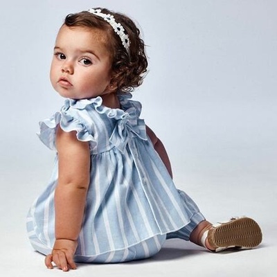 Příjemný materiál, volný střih a módní design, to je letní pruhovaná halenka pro malé holčičky od španělské značky Mayoral. celorozepínací na knoflíčky na zádech, zdobení mašlí...
