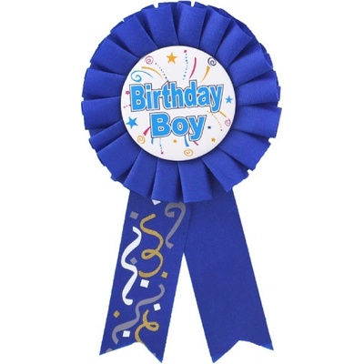 Narozeninový odznak pro oslavence modrý s nápisem Birthday Boy, šířka odznaku 7 cm.