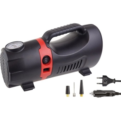 Tento vzduchový kompresor vybavený měřičem tlaku dokáže pracovat jak přímo z elektrické sítě, tak i skrze zásuvku automobilového zapalovače.