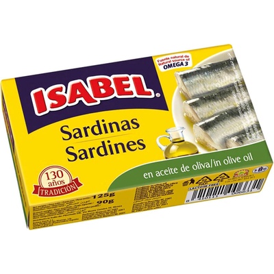 ISABEL Sardinky v olivovém oleji 125 g Vysoký obsah OMEGA3 mastných kyselin. Složení: Sardinky, olivový olej, sůl. Země původu: Maroko, baleno v Maroku.