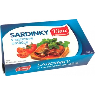 Sardinky v tomatové omáčce. Skladování:Po otevření ihned spotřebujte Složení:Sardinka obecná (Sardina Pilchardus) – (kuchaná) 72 %, rajčatová omáčka (rajčatový protlak 62 %,...