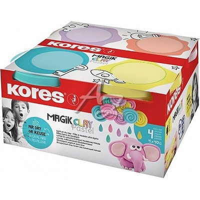Tvarovací hmota Kores Magic Clay pastel. Na vzduchu tvrdnoucí lehká tvarovací hmota. V setu 4 pastelové barvy: růžová, oranžová, žlutá a tyrkysová. Jasné, zářivé a intenzivní...