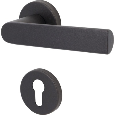 Dveřní madlo rovné Vnější strana madla plochá, vnitřní strana zaoblená. Materiál : Nerez se speciální povrchovou úpravou černá ocel. Na dotek jemně hrubý metalický povrch dodává...