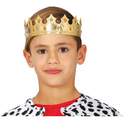 Zlatá královská korunka s kamínky Po obvodu je zevnitř nalepen molitan, pro konfortní nošení, korunka pak dobře drží na hlavě. Obvod: 66 cm Průměr: 20 cm Materiál: 70%...