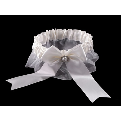 Svatební podvazek s velkou mašlí dobře pruží, příjemně se nosí. Mašle je ozdobená perlou s broušenými kamínky. Podvazek je zabalený v průhledné krabičce. Barva : off white ...