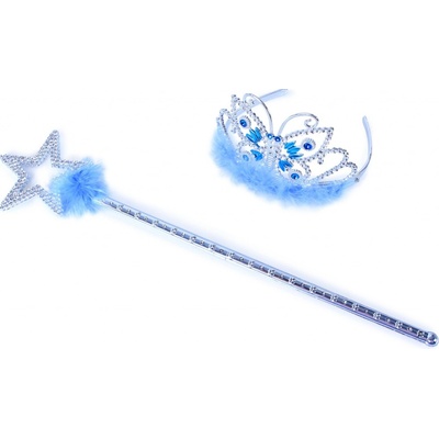 Exkluzivní sada pro zimní princezny! Tato stylová souprava stříbrné barvy obsahuje oslnivou korunku s modrými kamínky a žezlo. Vše je dekorováno ozdobným peřím modré barvy....