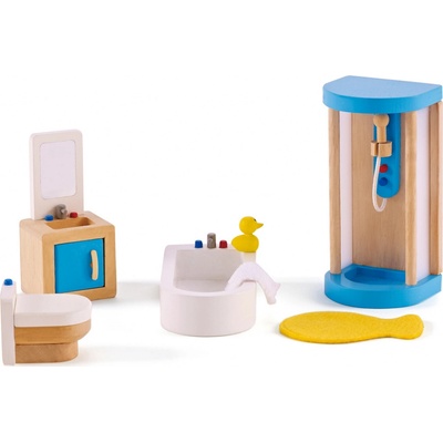 Tradiční a barevná sada nábytku a vybavení koupelny ze dřeva. Bude se perfektně hodit do dětských domečků pro panenky. Šest kusů nábytku a doplňky – vana, toaleta, umyvadlo,...