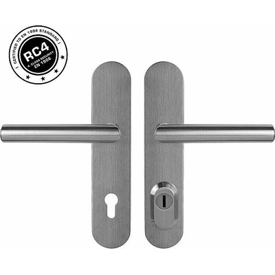 Nerezové štítové kování pro dveře v provedení klika-klika na klíč.