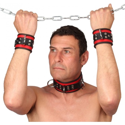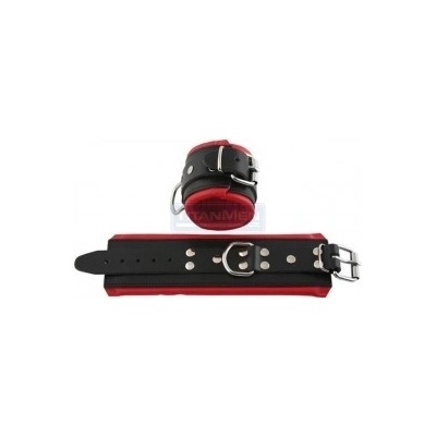 Kožená červená pouta na ruce red/black podšitá černou plstí. Šířka pout je 5 cm a obvod 14 - 25 cm. Pouta jsou spojená dvěma karabinami, které se dají rozpojit. Po stranách pout...