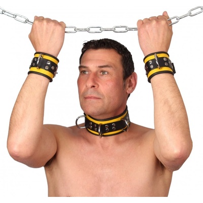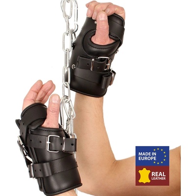 Masivní kožená zavěšovací pouta na ruce Masivní zavěšovací pouta na ruce s přezkami okolo dlaně a zápěstí. Oko pro zavěšení je umístěné na malíkové hraně. Zapínání na 2 přezky...