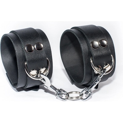 Kožená pouta s nastavitelnými řemínky a řetízkem s karabinami jsou vhodné na pevné spoutání zápěstí nebo kotníků. Šířka 6 cm.