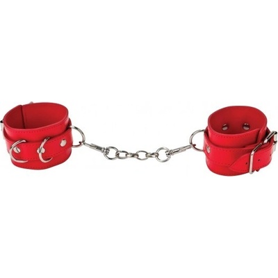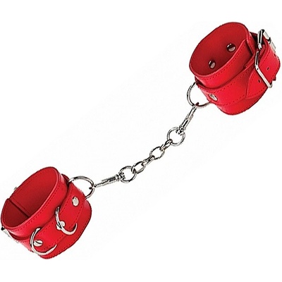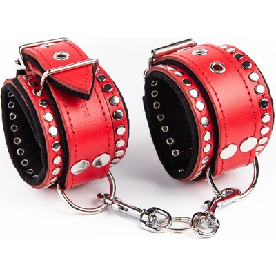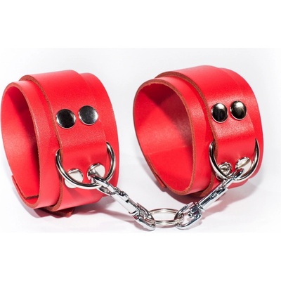 Kožená červená pouta na ruce. Šířka pout je 5 cm a obvod 14 - 25 cm. Pouta jsou spojená dvěma karabinami, které se dají rozpojit.