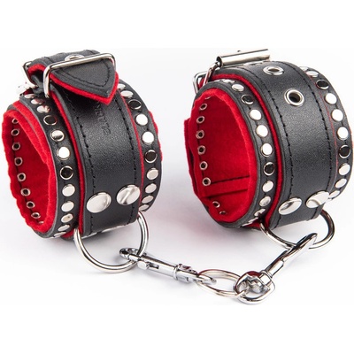 Kožená černá pouta na ruce black/red podšitá červenou plstí. Šířka pout je 5 cm a obvod 14 - 25 cm. Pouta jsou spojená dvěma karabinami, které se dají rozpojit.