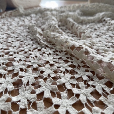 Bavlněná paličkovaná krajka má zajímavý motiv. Doporučujeme ji žehlit přes tkaninu. Použití: Krajka je vhodná ke zdobení oděvů, například halenek, sukní, šatů nebo kabátů....