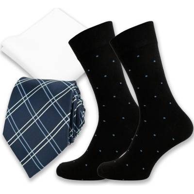 Tmavě modrý pánský set s kostkovanou kravatou – kravata, kapesníček a ponožky Elegantní pánský set v tmavě modrém odstínu kombinuje klasickou kostkovanou kravatu, čistý bílý...
