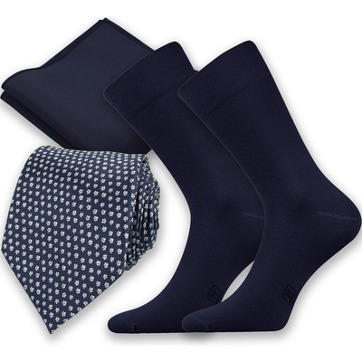 Tmavě modrý pánský set – kravata, kapesníček a ponožky Elegantní pánský set v klasickém tmavě modrém odstínu kombinuje kravatu s drobným květinovým motivem, jednobarevný tmavě...