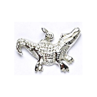 Stříbrný přívěsek ve tvaru krokodýla. Rozměr přívěšku včetně očka je 18 mm a na šířku 22 mm. Materiál je stříbro 925/1000. Orientační váha přívěšku je 1,65 g.