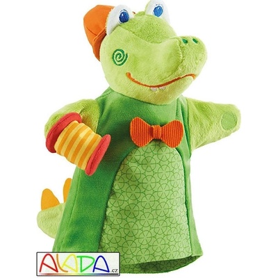 Loutka na ruku - krokodýl. Nejen maňásek, ale také společník pro nejmenší. Krokodýlek má v ruce pískací harmoniku. Materiál: polyester. 18 měs. +