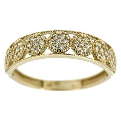 Elegantní dámský zlatý prsten vyrobený ze žlutého zlata v ryzosti 585/1000. Prsten má tvar prořezaného kroužku, ve kterém jsou usazeny kulaté ozdoby vykamínkované bílými...