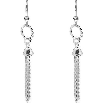 Stříbrné náušnice 925, malý kružek se zatočeným vzorem, visací dlouhý střapeček z tenkých hranatých řetízků, africké háčky.