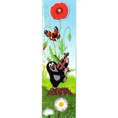 Dětská záložka do knížky, z tuhého materiálu (kartonu), oboustranně tištěná, s motivem Krtečka. Horní postavička/objekt na lícové straně vyseknuta a dolepena, takže ze záložky vystupuje (3D efekt). Celá záložka vložena do sáčku s lepící chlopní. Krteček je...