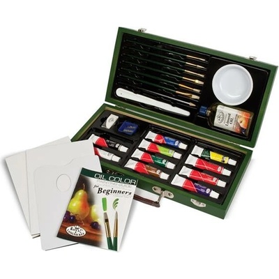 Praktický dřevěný kufřík obsahuje sadu na malování olejomalbou.