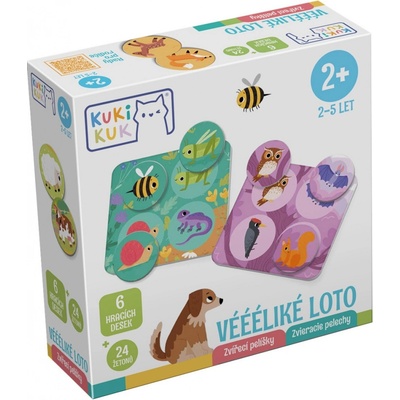 Betexa KukiKuk - Véééliké loto Zvířecí pelíšky Tato hra je skvělou volbou pro děti, které se teprve seznamují s různorodým světem zvířat. Díky 24 velkým kulatým žetonům, na kterých jsou zobrazena zvířátka na louce, v lese, ve vodě a jinde, se děti hravě učí rozpoznávat...
