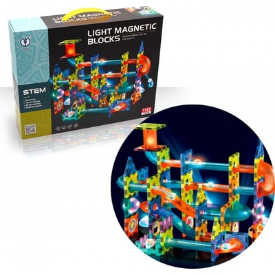 - Obsah balení: 110 dílků, včetně barevných magnetických dílů, svítících kuliček a speciálních prvků pro sestavení dráhy. - Interaktivní hraní: Kuličkodráha se světlem přináší...