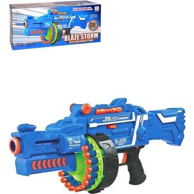 Rotační kulomet Blaze Storm se zásobníkem na 20 střel, dostřel 20 metrů, 40 nábojů v balení (20x pěnový, 20x přísavný), poháněno 6 x AA bateriemi (nejsou součástí), velikost zbraně 52 cm, nevhodné pro děti do 3 let.