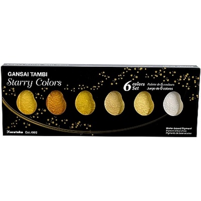 Gansai Tambi Starry Colors od Kuretake jsou akvarelové barvy, které obsahují pigment s metalickým pigmentem. Pro výtvarníky a profesionální umělce. Široké využití - ilustrace, písmomalířství a další... Sada obsahuje 6 hvězdných odstínů! Pro aktivaci barvy naneste...