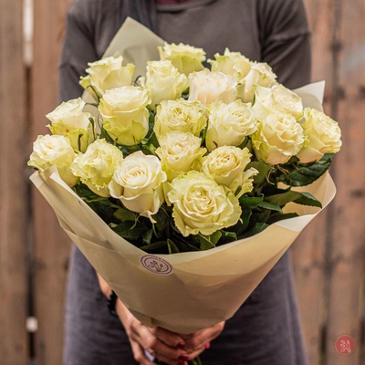bílá růže mondial, velký květ až 7cm, délka stonku 70cm. Růže jsou svázané pouze stuhou do pugétu a papírem dokola. Počet kusů závisí na Vás. Na obrázku vidíte pugét z 19 ks...