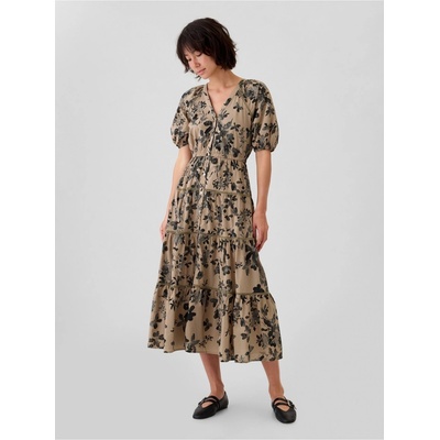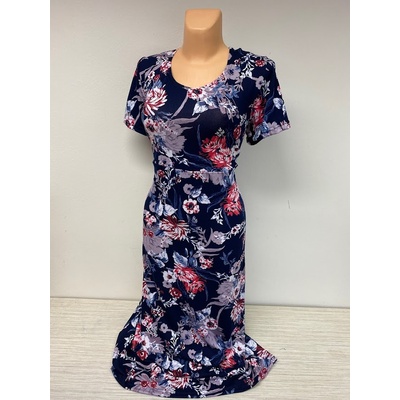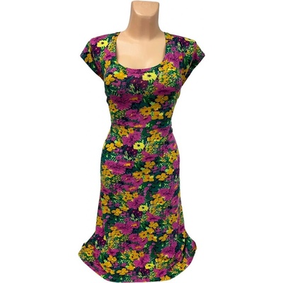 Dámské květované šaty.Vykrojený výstřih.Na zádech čtvercový výstřih.Krátké rukávy.V zádech pružné řasení.S metalickou nití.Midi délka.