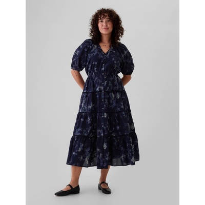 Dámské košilové šaty. S květovaným potiskem. Výstřih do V, zapínání na knoflíky. Délka rukávů po lokty, lehce nabírané. Spodní část s volánem. Délka nad kotníky. Modelky...