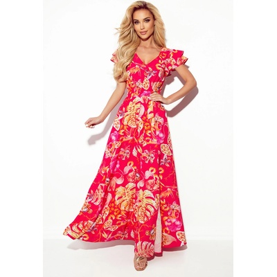 Lidia - dlouhé šaty s výstřihem a volánky na ramenou. Barva: růžová s květy a listy. Materiál: 95% polyester, 5% elastan Kategorie: Dámské květované šaty Střih: Rovný...