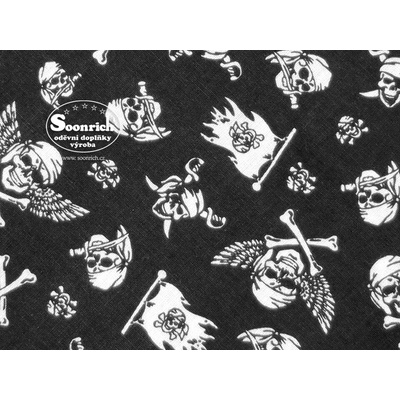 látka na patchwork pirátské lebky, materiál: 100% bavlna, rozměr: 100 x 20 cm, vzor: lebka 2 - 5 cm, pirát, hnáty, kosti, meče, barva: bílá, černá , Látka na patchwork je...