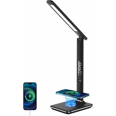 stolní LED lampa, bezdrátová nabíječka standardu Qi, dotykové ovládání světla, změna chromatičnosti světla (2700K-5500K), funkce: čas, datum, teploměr, budík, naklápěcí...